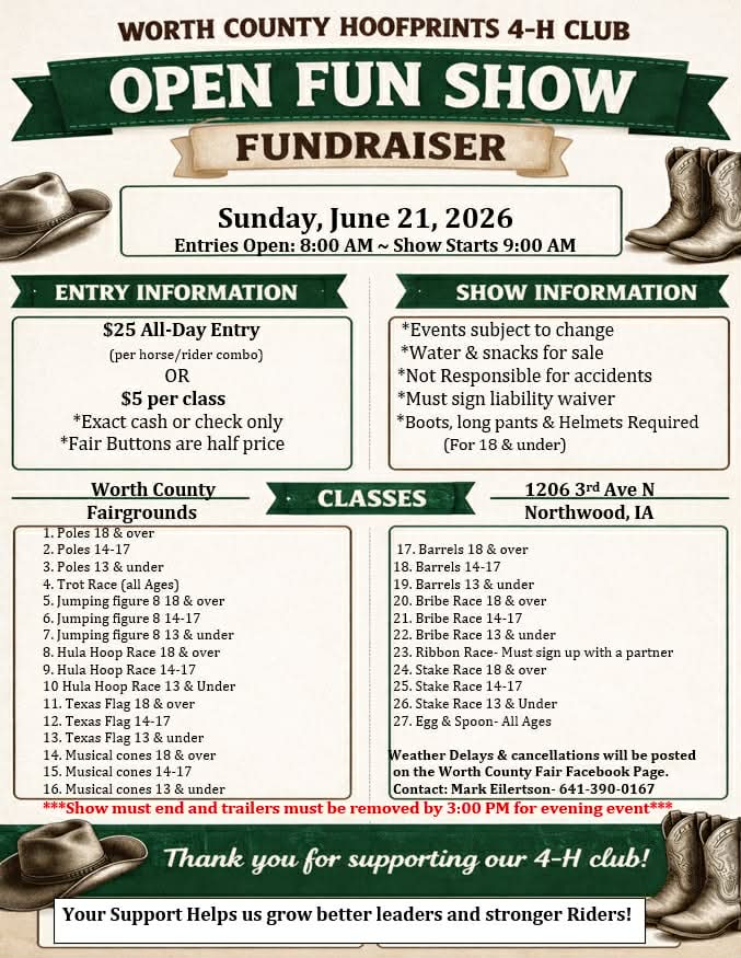Queen candidates, this is your chance showcase your poise, character, build friendships and represent Worth County at the Iowa State Fair in August! Ladies 16-21 living in Worth County (or an adjoining county with a majority of activities in Worth County) are welcome to apply. You do not need to be part of Worth County 4-H to qualify. Entry form, questionnaire, contest rules, and guardian consent form can be downloaded below. To enter, complete all three forms and submit to with a recent photo (4×6 or smaller) by June 1, 2026. Judging will take place June 7, 2025 at 1pm in the Worth County Community Room.